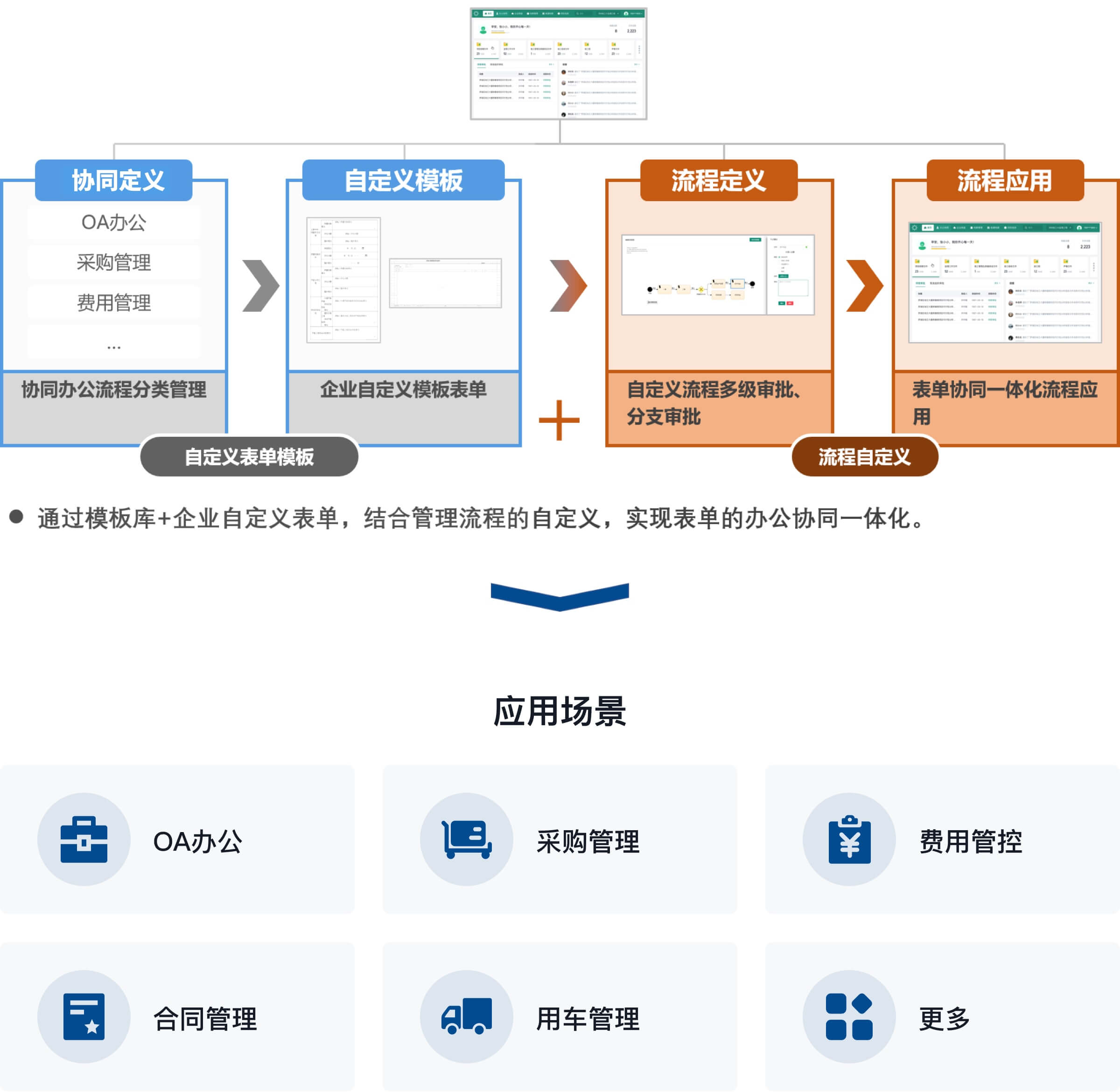 通过模板库和企业自定义表单结合自定义业务流程,实现企业办公协同一体化。